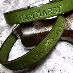 Läderarmband i olika färger där texten stansas direkt på lädret.