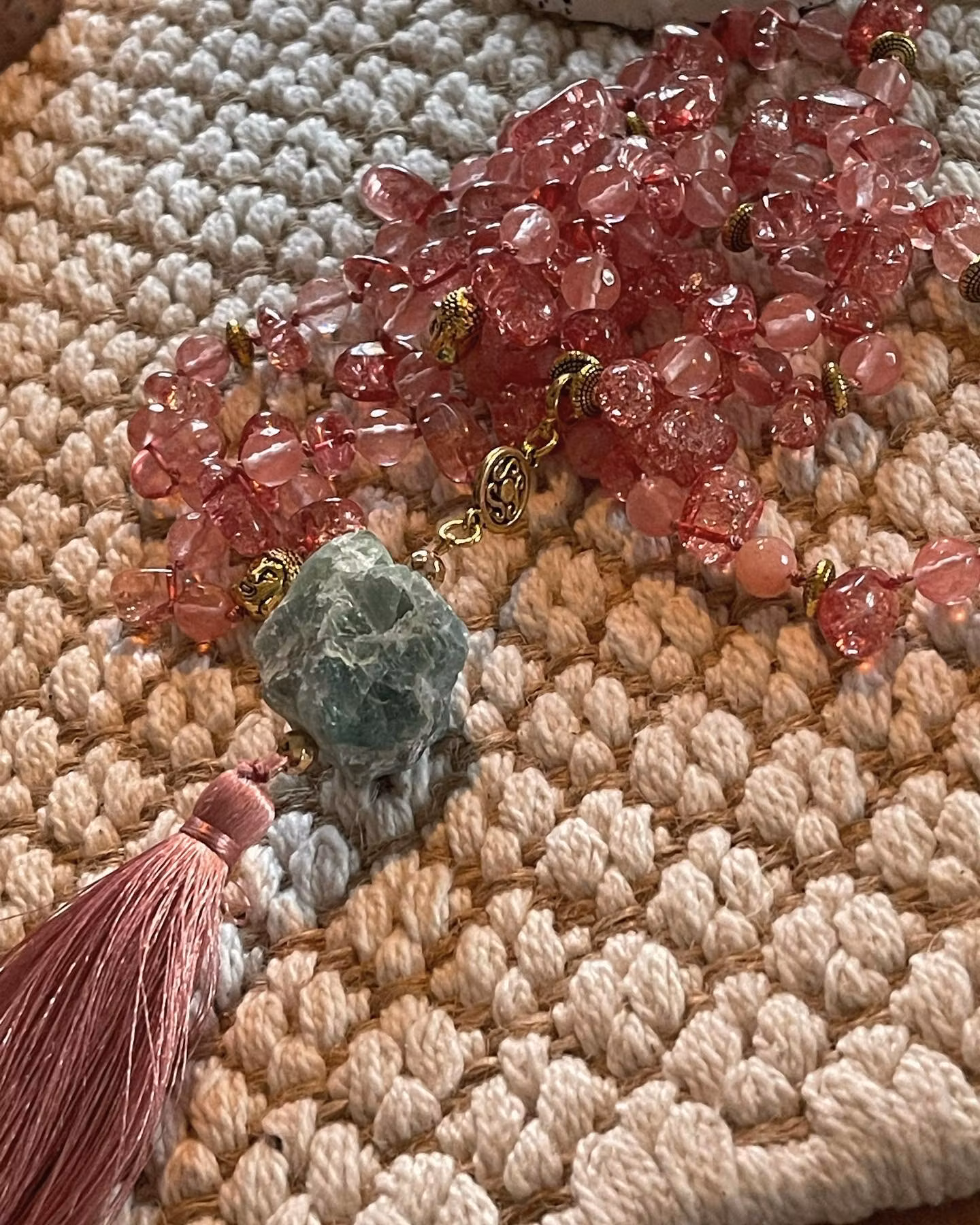 Det här halsbandet är helt fantastiskt vackert. Rosaskimrande bergskristallnuggets tillsammans med en rå härlig grön Fluoritsten och en fin tofs i siden.