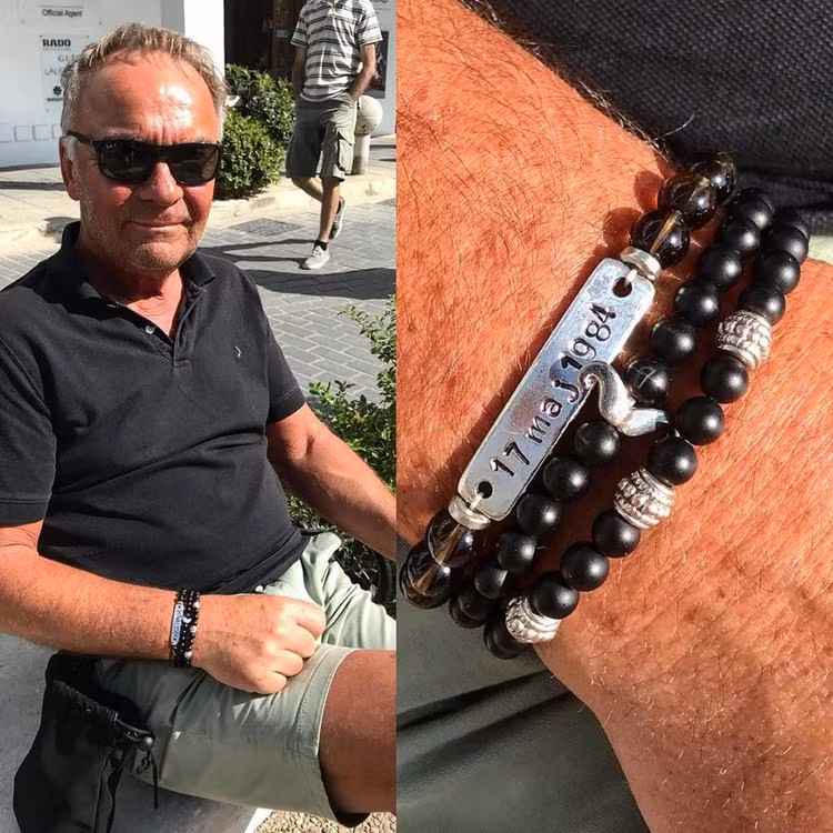 Svarta matta onyxpärlor 200 kr Storlek 17 mm (small) 18 mm 19 mm (medium) 20 mm 21mm 22 mm (large) I lager. Lägg i korgen Lagersaldo: Artikelnummer: 113 Dela Information Armband med matta svarta onyxpärlor och med några fina metallpärlor.Jättesnyggt att kombinera med fler armband, ex MustaschArmbandet som på bilden.
