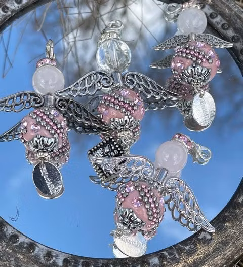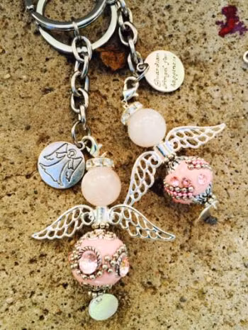 Med ett huvud av Rosenkvarts (kärlekens sten) och en handgjord orientalisk pärla som kropp blir den här ängeln fulländad.